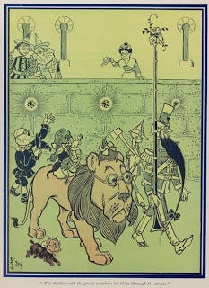 The trouble with this metaphor was that I had read The Wizard of Oz as a kid. I'm talking about the book written by L. Frank Baum not the movie, they are very different. In the movie the Emerald City is, well, made of emeralds. But in the book it's all a fraud, through and through. So why does everyone think the city is made of emeralds? Well, this is why: