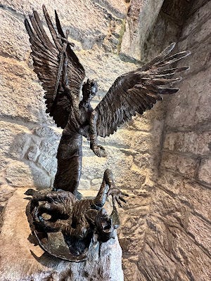 Last summer, visiting the chapel in the castle at the top of St. Michael’s Mount in Cornwall, I was interrupted by a statue of St. Michael created by Lyn Constable Maxwell, commissioned in 1989.