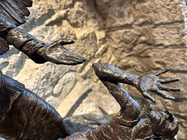 Notice two things. First, Michael isn’t stabbing down with the sword. Instead the sword is held upside down to create a cross. The sword is inverted to become a sign of grace, mercy, pardon, and forgiveness. Second, Michael’s hand is held out and is upturned. Michael is extending an invitation. Of help? Of grace? Of return? It was that open hand which interrupted me.
